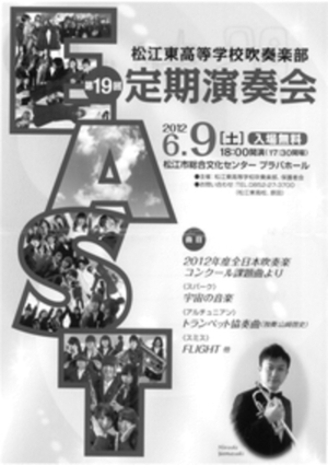 松江東高等学校吹奏楽部による第19回定期演奏会が開かれます2012年6月9日(土)松江市総合文化センター プラバホール18:00開演(17:30開場)たくさんの方のご来場をお待ちしております